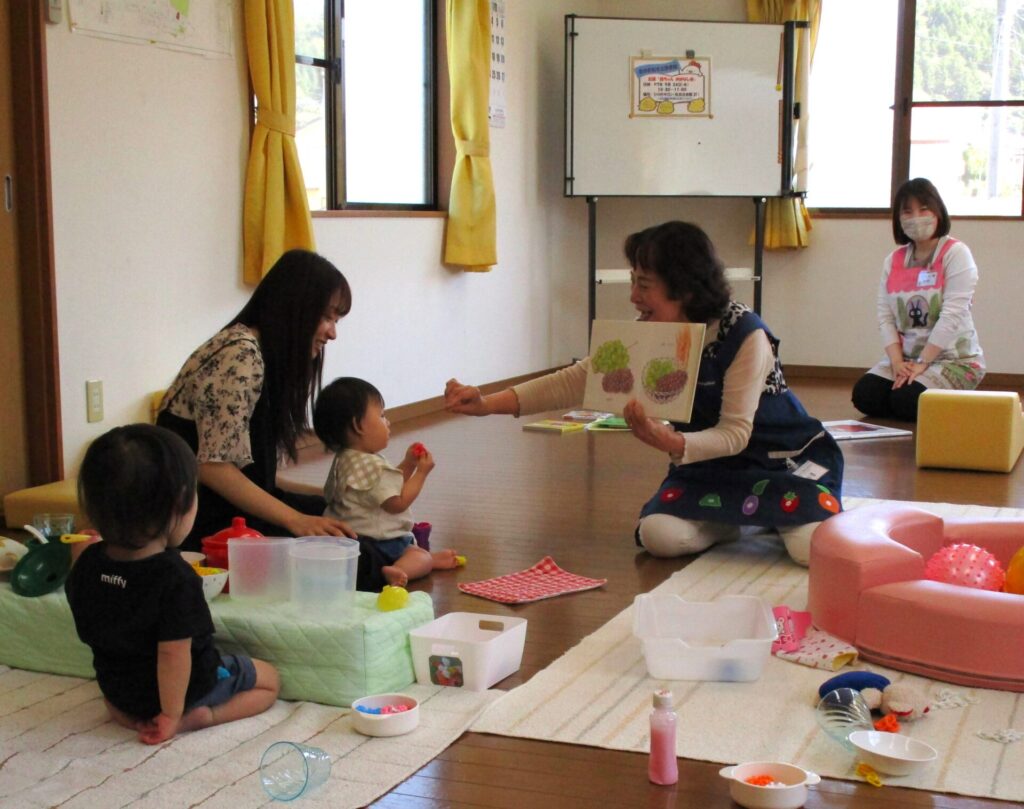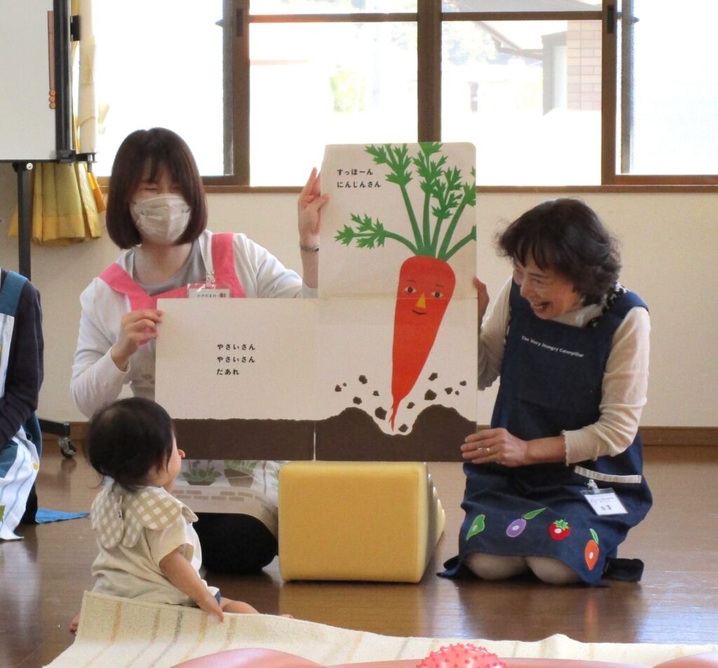先月末、会津図書館による出張「赤ちゃんおはなし会」をひのきサロンで行いました。手遊びや大型絵本などを見て、声を出したり体を揺らしたりながら楽しんでいましたよ。興味のあるお話が始まると絵本の前に行ってちょこんと座ってみたり、好きな遊具で遊びながらもチラチラ反応する姿があり、それぞれが絵本に触れて心地よく過ごす良い時間となりました。