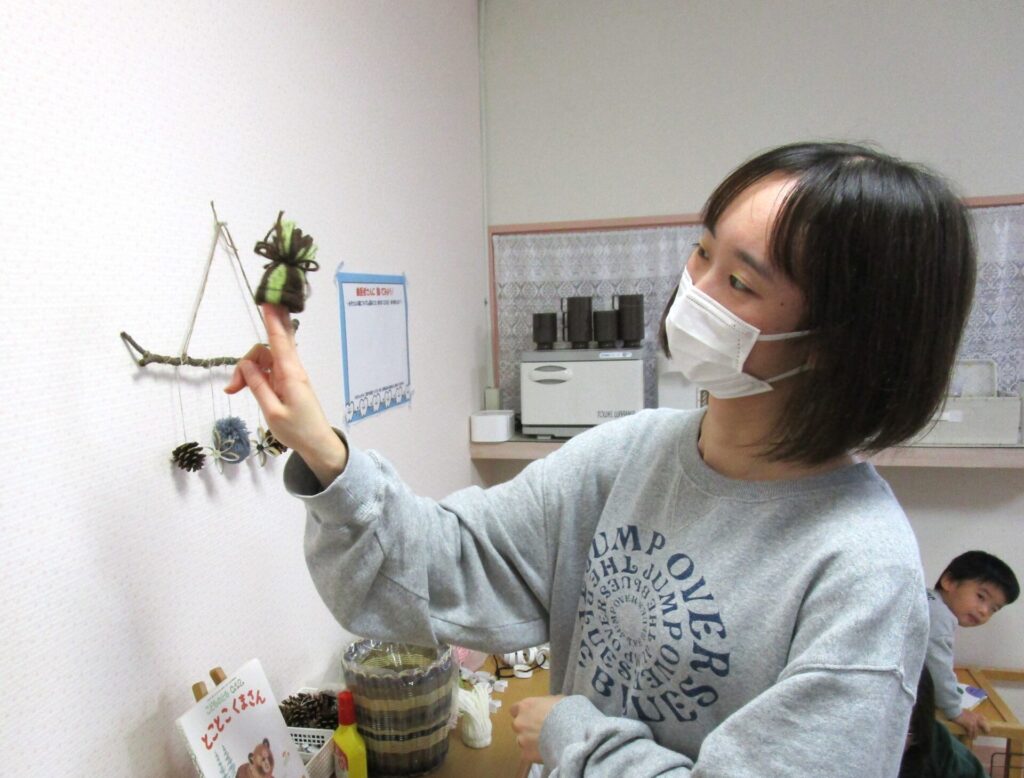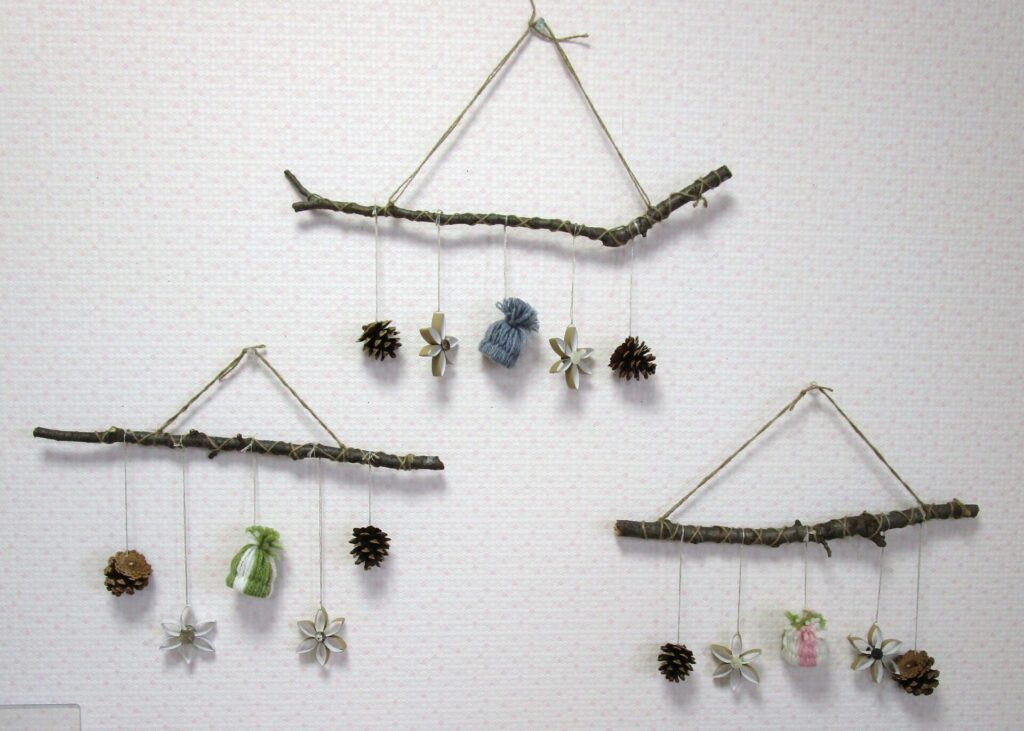 自然物飾り作りをしました。松ぼっくりや毛糸で作った小さな帽子、トイレットペーパーの芯で作ったお花を木の枝に飾って・・・。小さな帽子はそれぞれ好みの色を2色使ってボーダーのようにしたり、三つ編みに編んだり工夫しながらオリジナルの飾りを作っていましたよ!!これからの季節にぴったりな素敵な作品ができました。