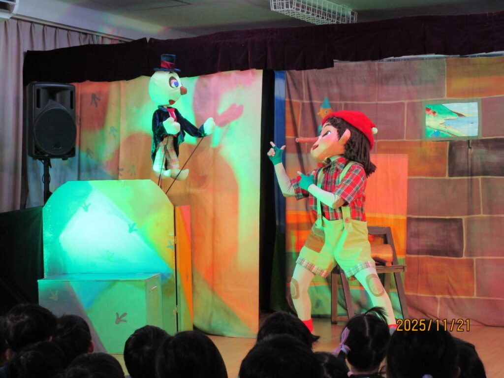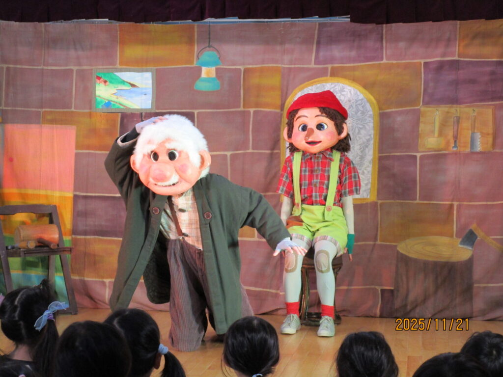 先月、劇団バグによる人形劇「ピノキオ」が行われました。楽しく迫力ある演技に驚きながらも会場全体が笑い声に包まれていました。公演後には記念撮影をしたり、頭をなでてもらい握手をしたりと、最後まで盛りだくさんの内容でした。毎年、観劇の機会を設けていますが、次回は春です! ホームページでもお知らせしますので、どうぞお楽しみに‼