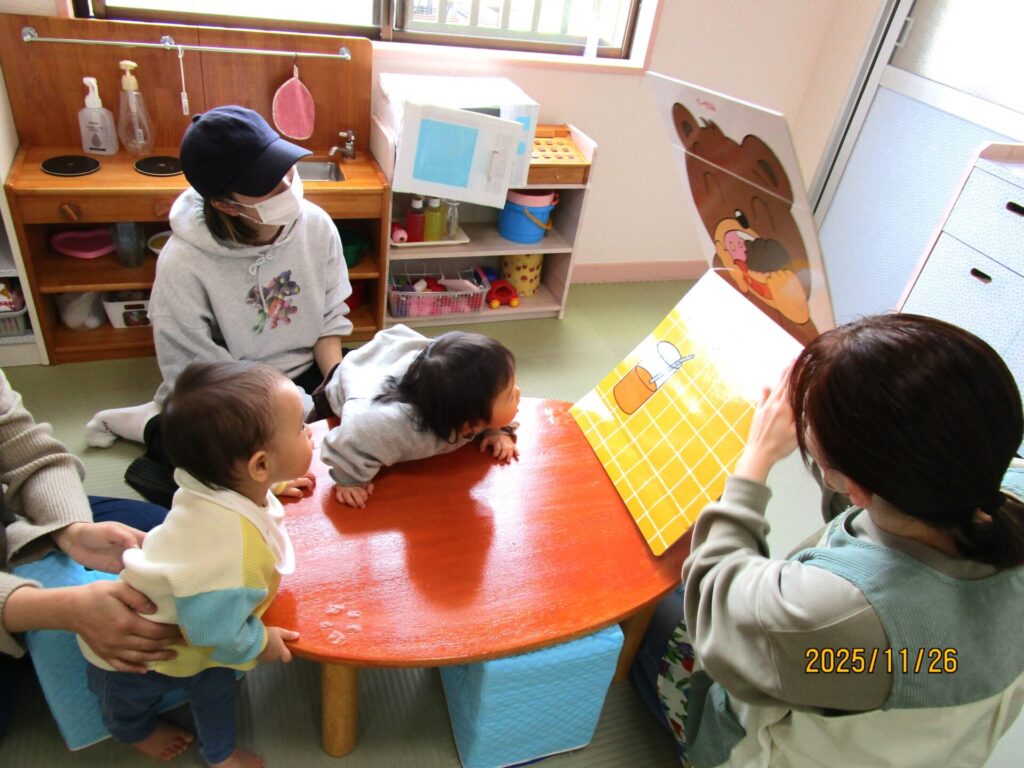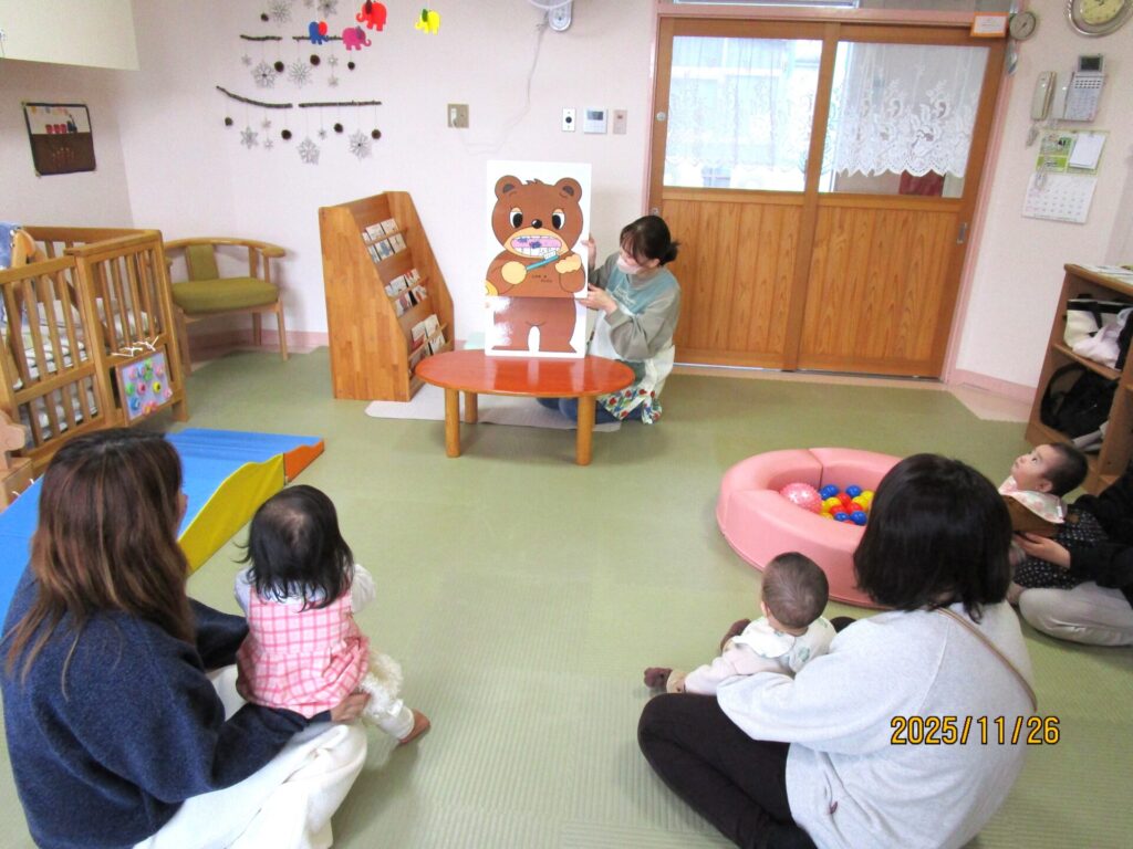 大型絵本に興味津々。読み終わってからも「また読んで」と何度も指差ししていましたよ。絵本の後は、歯についての悩みや心配なことの話をしました。事前に聞いていたことの中には「歯磨きを嫌がる。」「歯が斜めに生えているから気になる。」「指吸いをするから出っ歯にならないか心配。」などの声がありました。皆さん、同じ悩みを抱えていたり、「うちだけかも?」と不安の方もいたようです。少しでも悩みや心配なことが解消できたら…と思います。