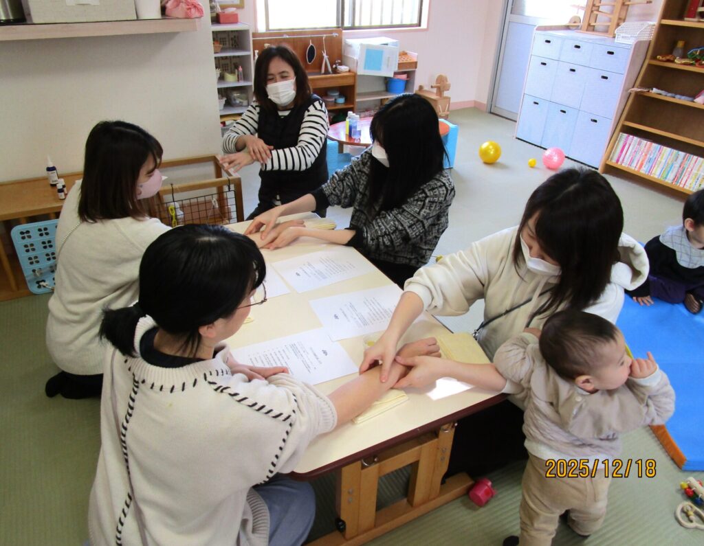 先日、アロマ教室を行いました。ラベンダー等の好みのオイルを使って講師の先生に教えていただきながらペアでマッサージをしました。お部屋全体がいい香りに包まれる中、子ども達もご機嫌で遊んでいましたよ。ママ達も少しの時間でしたがリラックスすることができたようです。