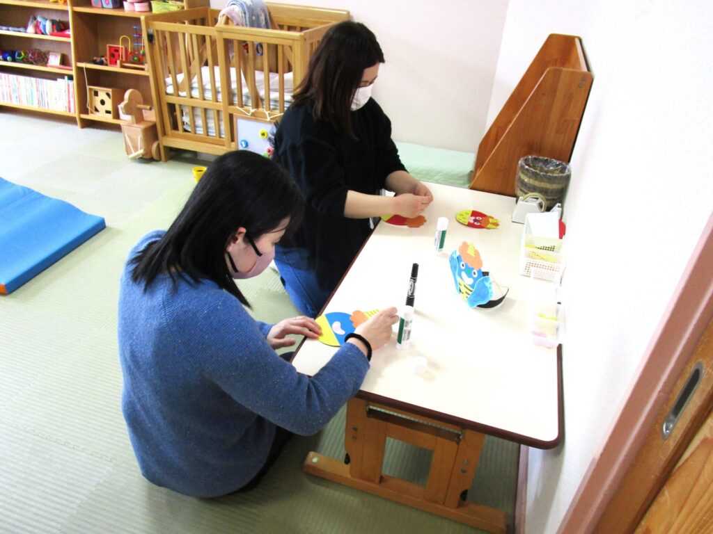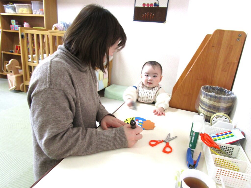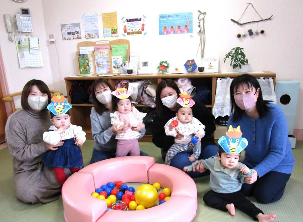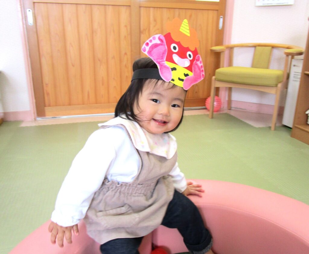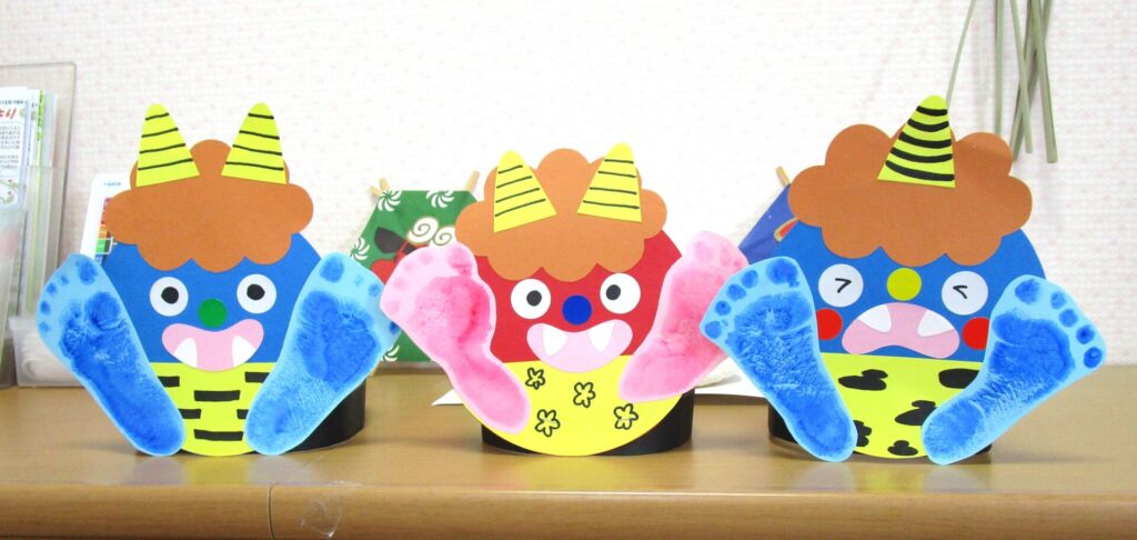 鬼のお面づくりを行いました。お子さんの足形が可愛らしいですね♡気に入って被ったままずっと遊んでいるお子さんもいましたよ。豆まき当日も楽しみです。