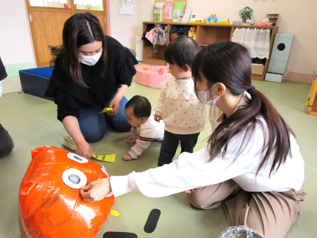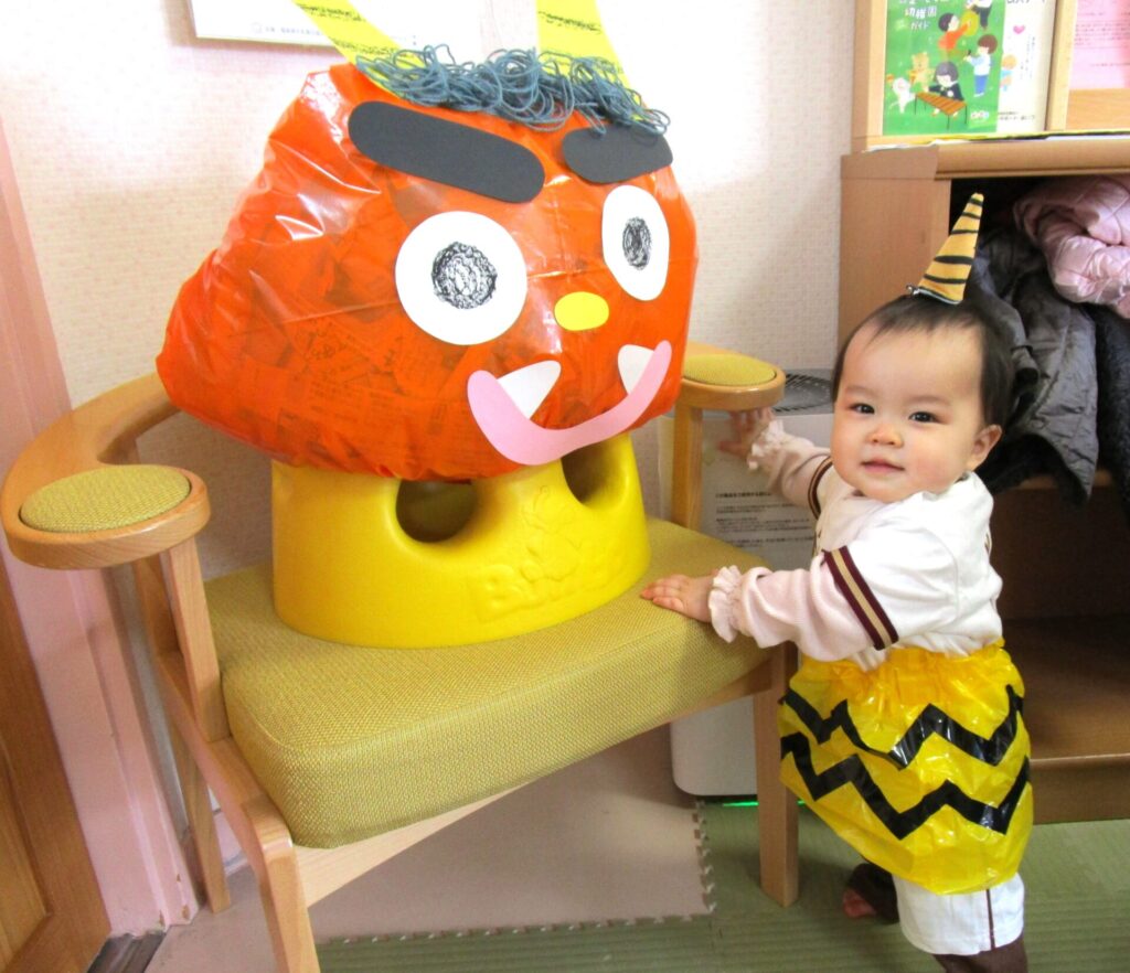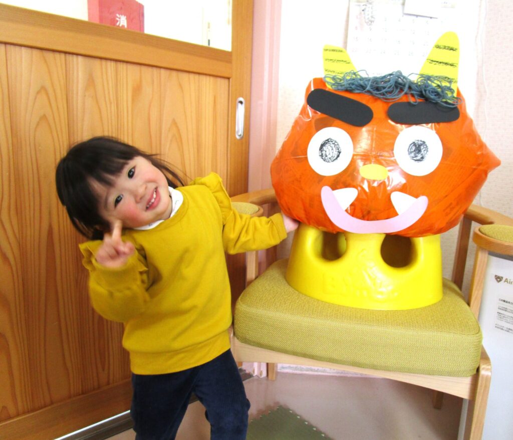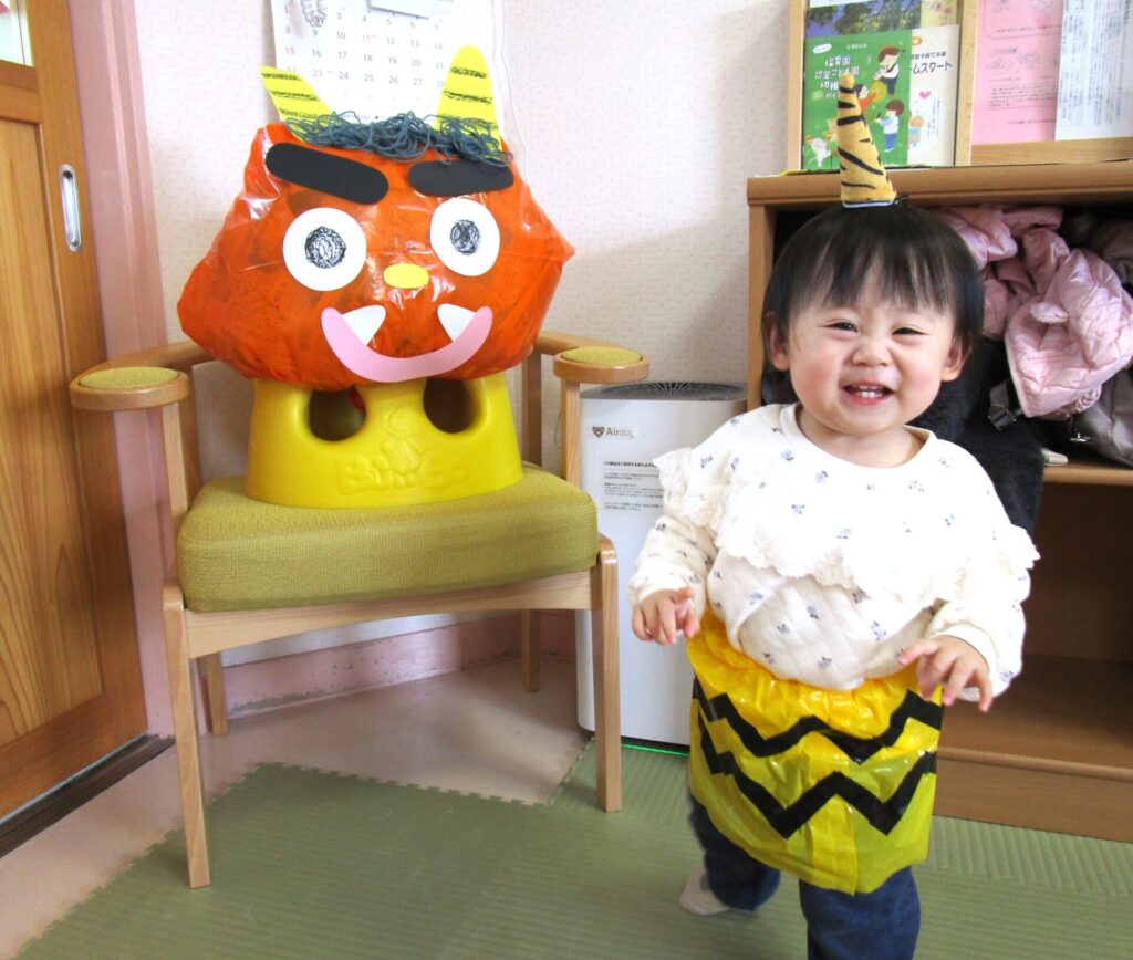 新聞紙遊びを行いました。ビリビリ破いたり、丸めたりして楽しみました。たくさん遊んだ後はビニール袋に詰めて・・・目や口、角を付けたら、「鬼」の出来上がり!!お友達も鬼のスカートや角をつけて可愛い鬼さんに変身です♡新聞紙遊びはお家でも簡単にできるのでおすすめですよ。
